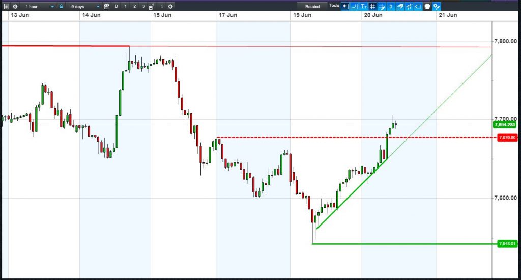 Technicals: The UK 100 is making a bullish test of 7700, trying to regain last Thursday’s 7794 June high.