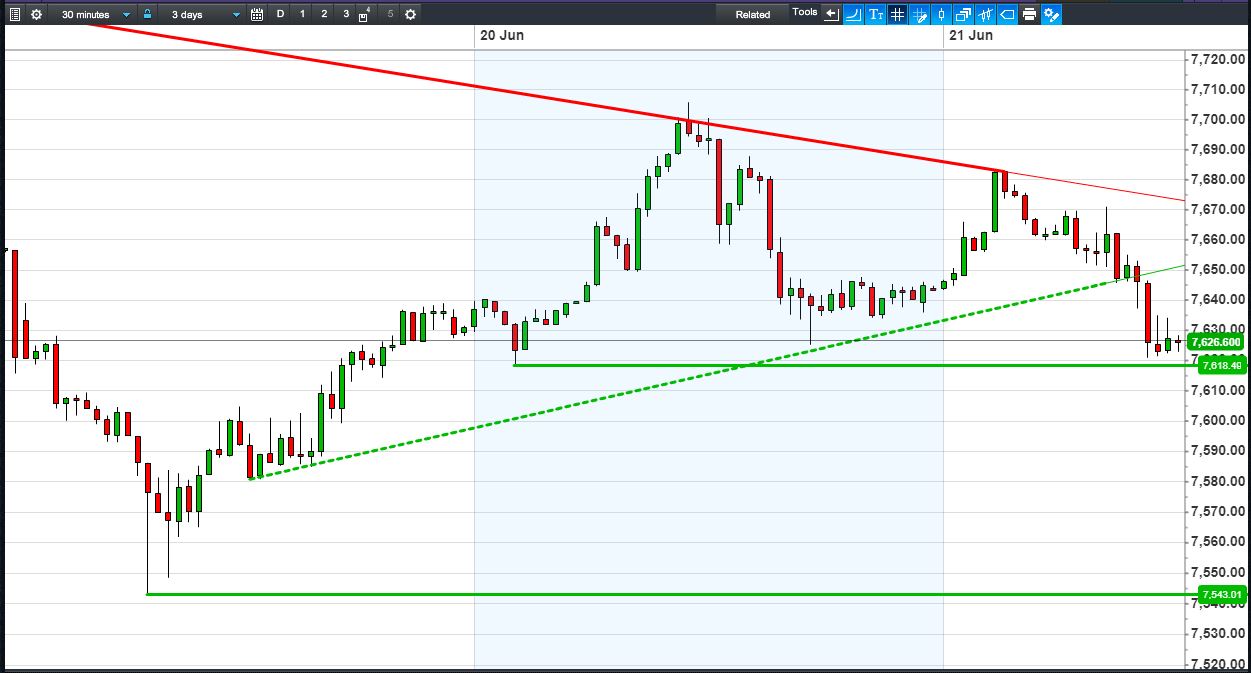 Technicals: The UK 100 broke below week-long rising support, but holds above Tuesday’s 7618 lows.