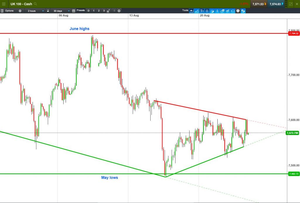 Technicals: The UK 100 is flat after testing 7600 falling highs resistance earlier in the morning