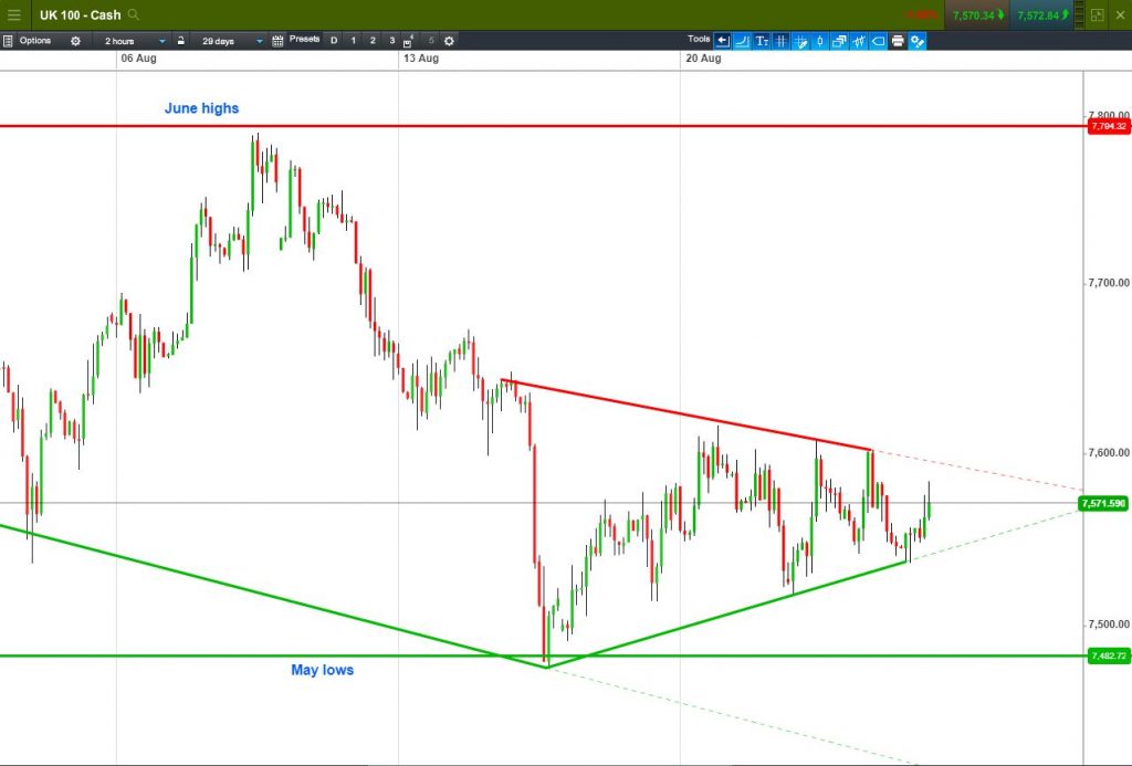 Technicals: The UK 100 is maintaining the indecisive sideways movement in a 5-day narrowing pattern.