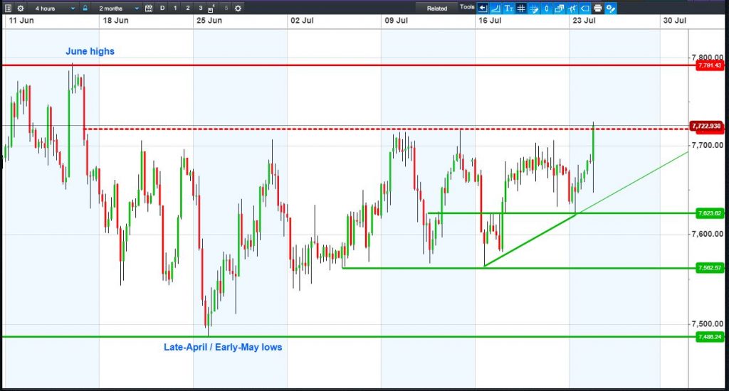 The UK 100 is testing July highs for a potential challenge to 7794 June highs.