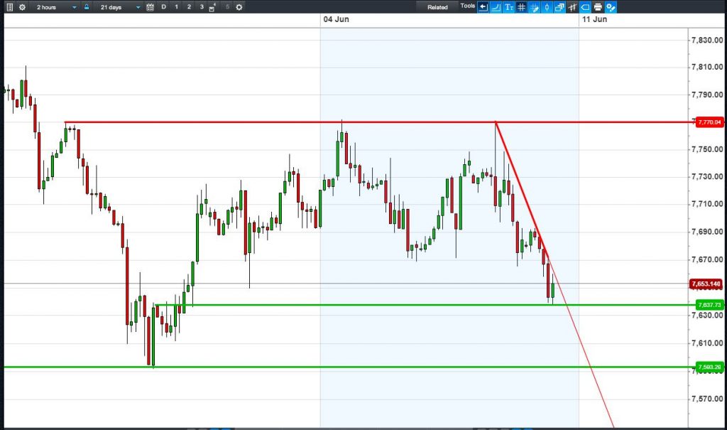 The UK 100 is off its worst levels, but still trying to overcome yesterday’s downtrend towards late May’s 7590 lows. Bulls need a break above 7670. Bears require another break below 7640