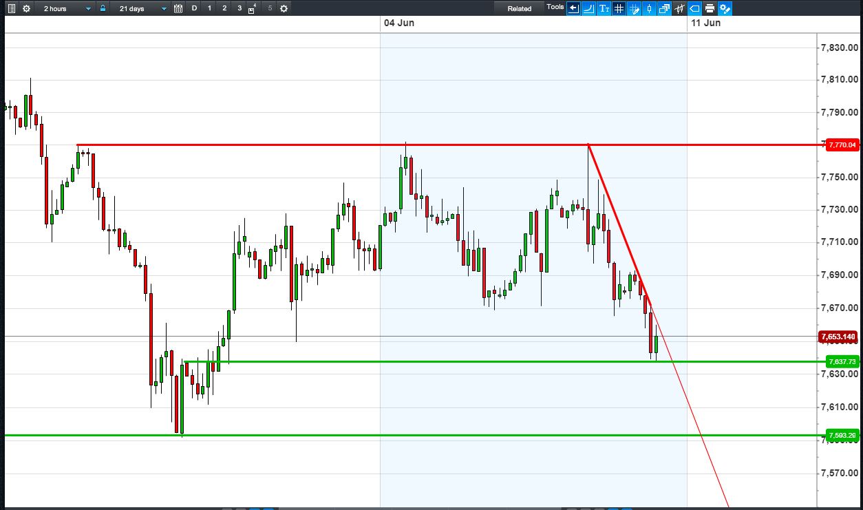 The UK Index , along with other major indices, is on the back foot into the weekend, with the usual help from positive China trade data (exports and imports stronger than expected), and an easing in European political distractions, being overshadowed by potential for a Trump vs G6 trade war confrontation at the G7 summit in Canada.