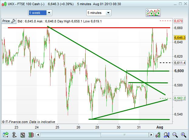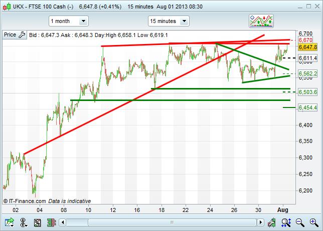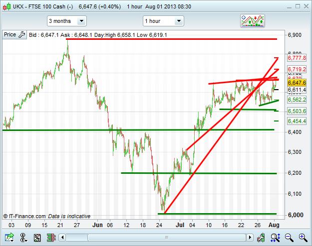 Still watching for a break of 6660, to rekindle uptrend. Support likely around 6600 round number then 6550 and 6500. The power of round numbers. The Fed has spoken, now over to the BoE and ECB and the rest of the PMIs.