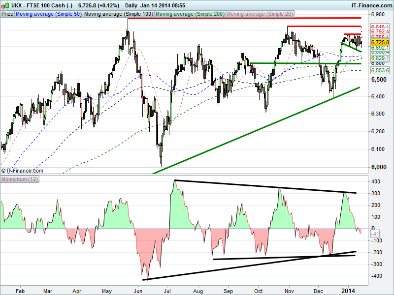 Having failed to test festive highs 6770 yesterday and breached rising lows from mid-December at 6720 last night, we have seen a test below 6700 this morning. We are, however, back up around the breakdown level of 6730 as bulls take control. A break above this would be required to regain 6770 to rekindle the chance of a breakout and resumption of the long-term uptrend after a lengthy festive sideways pause . Daily momentum remains negative with the failed breakout itself late last week. With very shallow falling highs, is a bigger correction on the cards or is this just another blip?