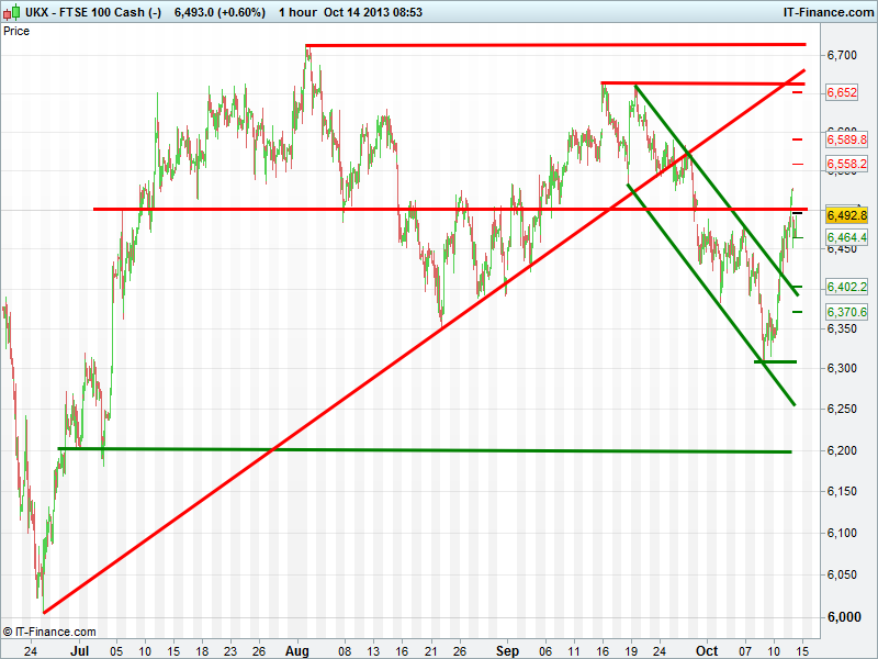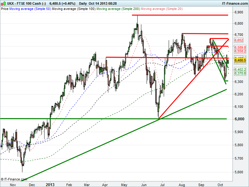 While markets got excited on Friday about the prospect of a weekend that could see US politicians resume proper negotiations, we’re back where we were (around 6500), below the ceiling that has been in place for most of October and around which we have oscillated since early July. Our 1-week growth shows rising lows. Our 3-month graph shows a breakout which is revisiting a significant hurdle.