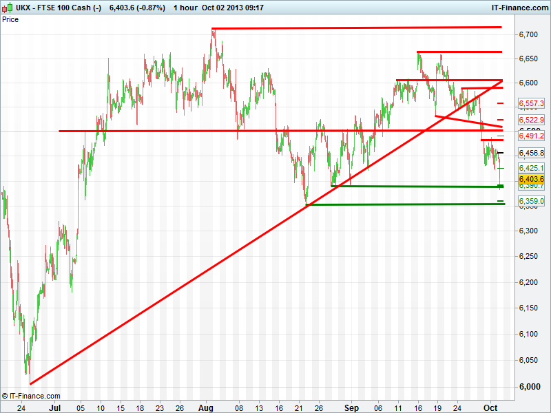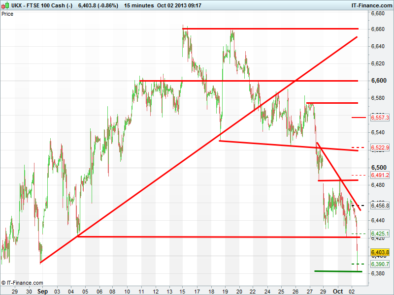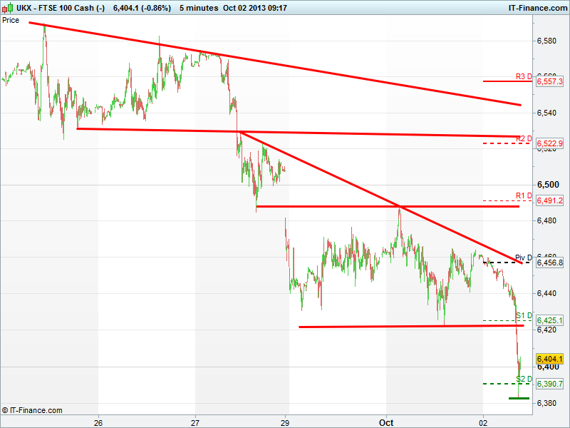 The UK 100 break below 6400 takes retraced us to the lows of late August, the sell-off accelerating this morning. A trendline over falling highs from Friday meaning another upside hurdle at 6450, on top of the 6425 level of 2-day support and 6485 resistance to we already have to contend with. Regaining 6400 by 9.30am is a start I suppose.
