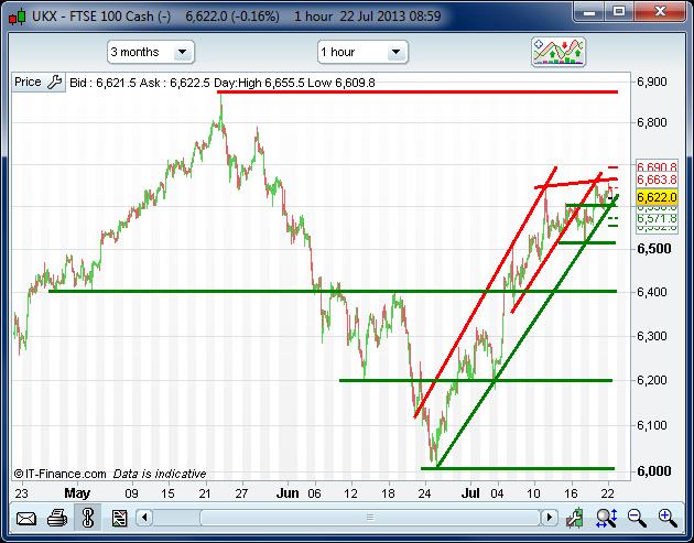 The index rebound from end-June is intact, however, 6655/60 has become a bit of a hurdle. Some are worried at the loss of momentum and a possible correction to 6500 ensuing; others content to see the sideways action and consolidation persist, increasing the potential of a more solid platform ad springboard being created for a continuation of the July rally and possible revisit of May and 13.5yr highs of 6875.