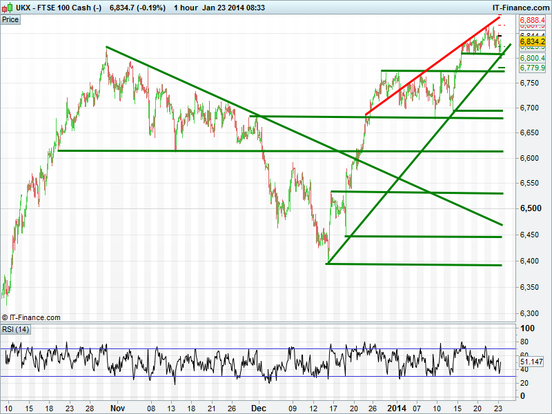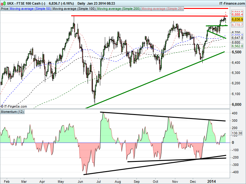 With 6840 having been a key level for the last few days we are watching to see whether it proves resistance this morning. Thereafter we need to beat overnight highs of 6850 and then the group of peaks around 6865. Daily momentum still pointing north but 3-month hourly RSI dropped back to near 13 Jan lows. Will it go all the way to oversold? Need the index correct further?