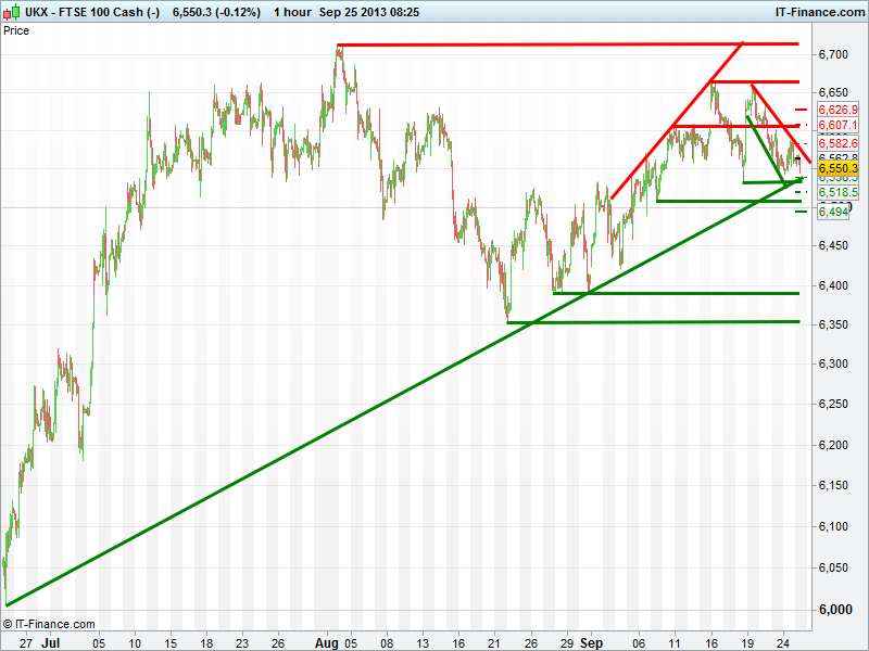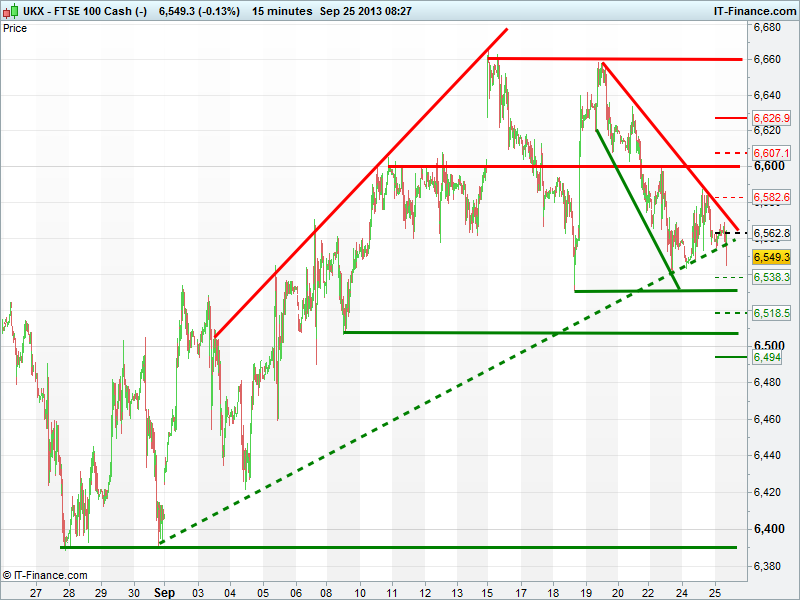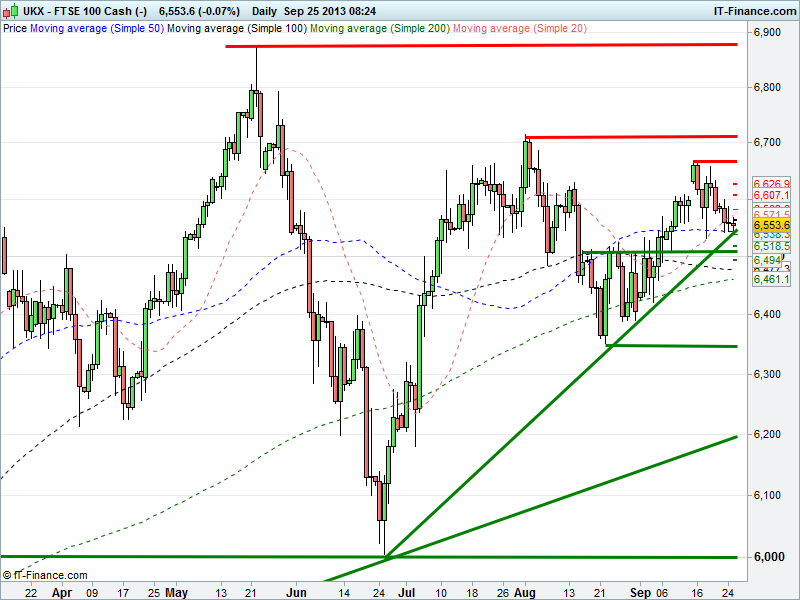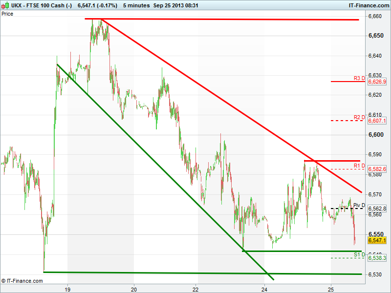 In terms of levels, with the rising lows of September being tested as we write, we are watching the lows of the last 2 days for support at 6540. Nonetheless, we note that the 3-month chart suggests rising lows yet to be breached, meaning 6535 may be a better level to watch. Short-term, the falling channel post-no-taper maintains its southerly course putting the index in a narrow 30pt range. Ripe for a breakout or breakdown.