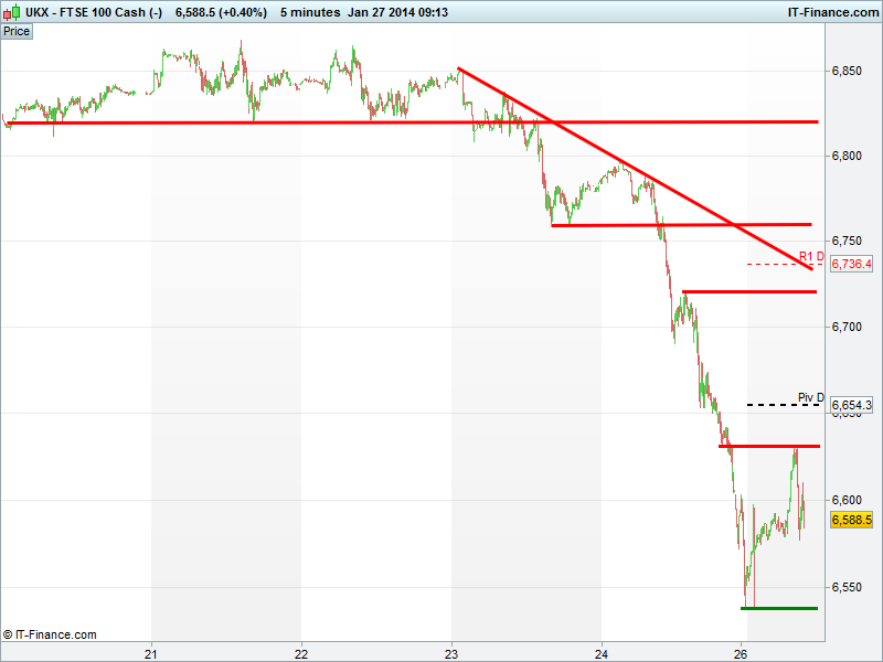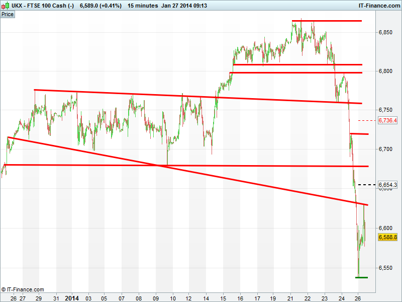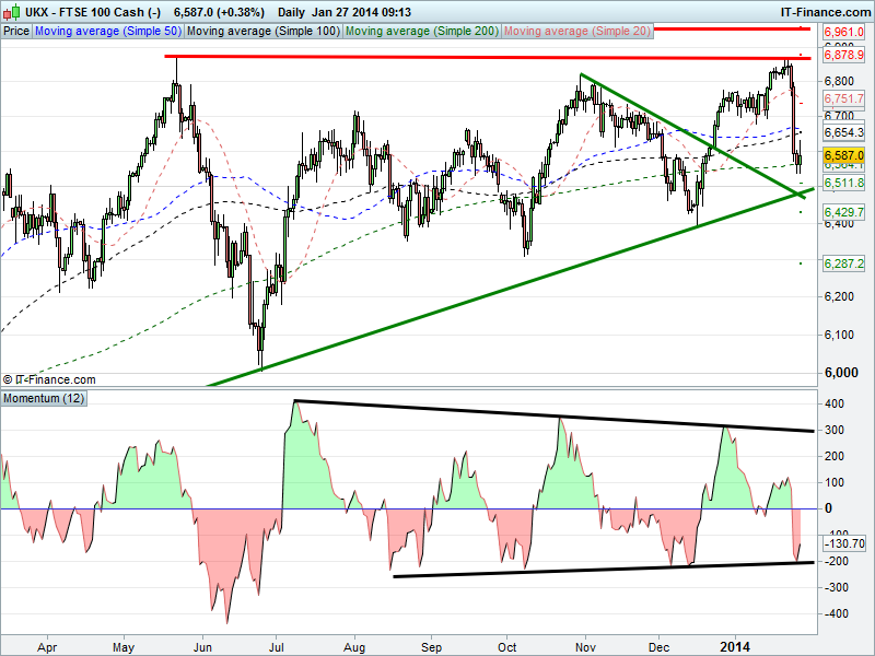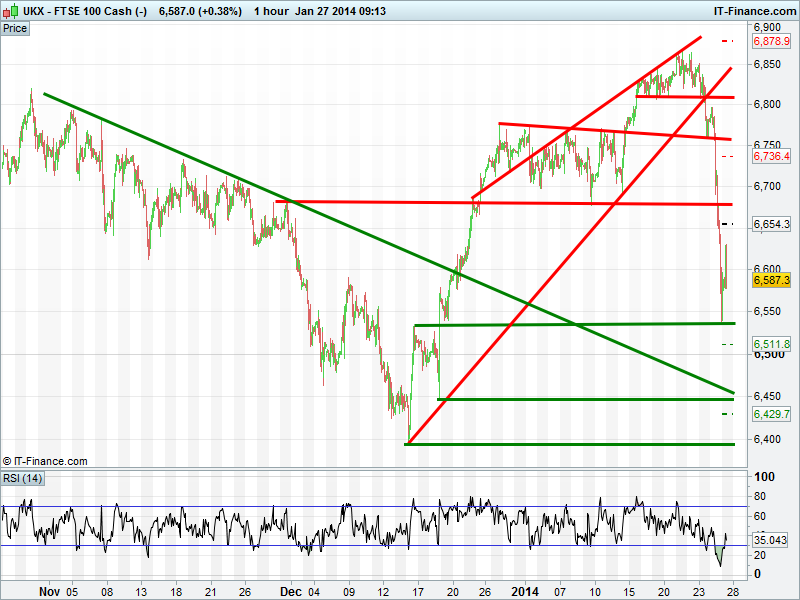 Friday’s sell-off and capitulation on the bubbling over of concerns ranging from China/global growth recovery, emerging FX devaluation, the effects of QE3 tapering on emerging markets and political unrest has seen the UK flagship equity index retrace 5% from its 6865 highs to before finding support at the 6535 level of 15-19 Dec, undoing much but not all of the December rally from 6395.