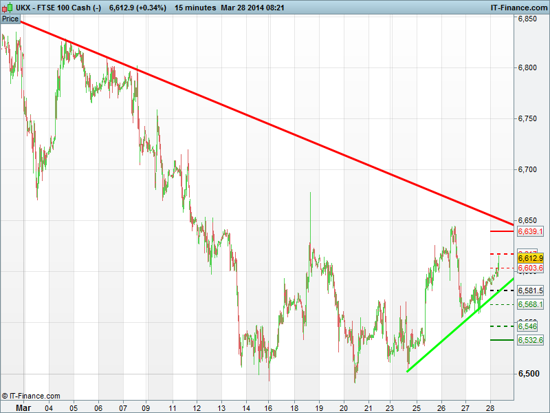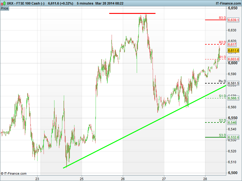 The UK 100 has taken the baton from a positive trading session in Asia overnight and has broken above resistance at 6603, which is a level that has key over the last few days in both a resistance and support capacity. A raft of macro data due for release today could cause some extra volatility on the UK Index , starting at 9:30 with UK GDP! Macro data aside, with a break back above 6603 we look to target 6617 and then on towards Wednesdays highs of 6640 before an attempt back up toward 6700. On the downside we could see resistance again at 6603 as well as 6581, 6568 and again at 6546.