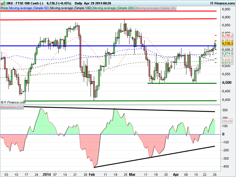 The lessening of a geopolitical overhang has helped the index push through the intersecting trendline of resistance since mid-March. Only a test for now [hence in blue], key will be whether it can revert to support today to form a base for a move towards Feb highs of 6875. After another test yesterday, support still available 6645-6665.