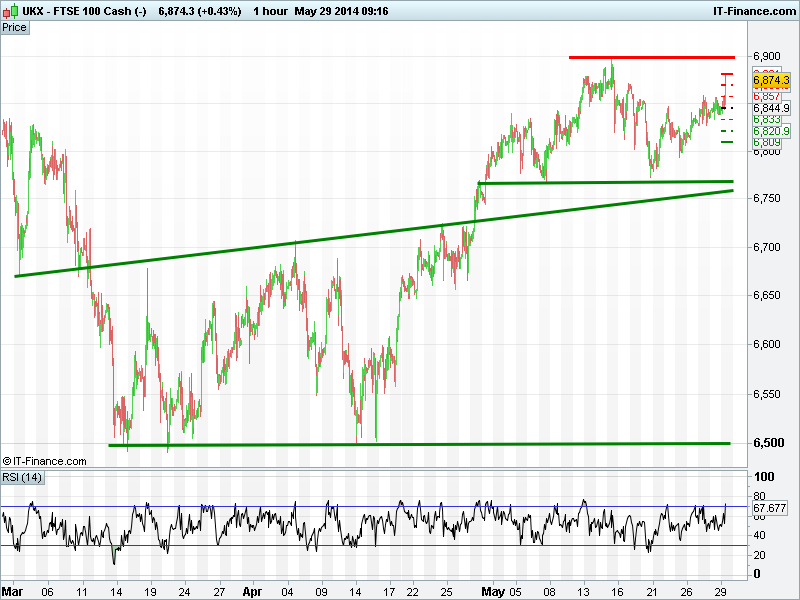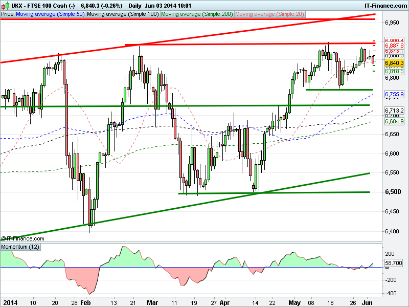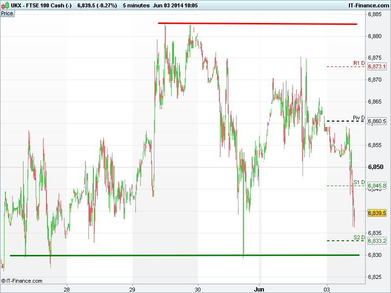 Pivot Point: 6861; Support 1, 2 & 3: 6846, 6833, 6819; Resistance 1, 2 & 3: 6873, 6888, 6900