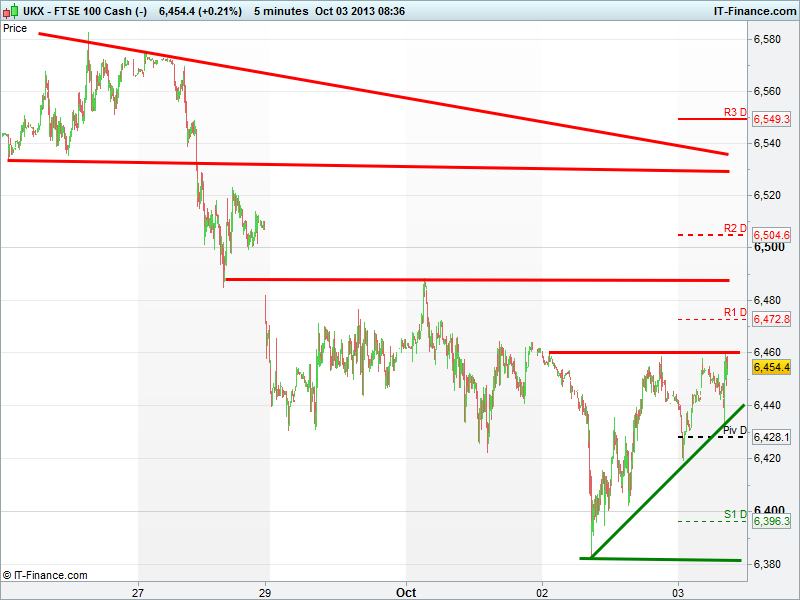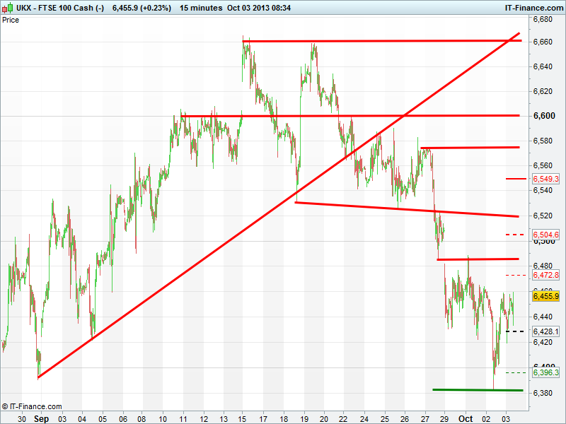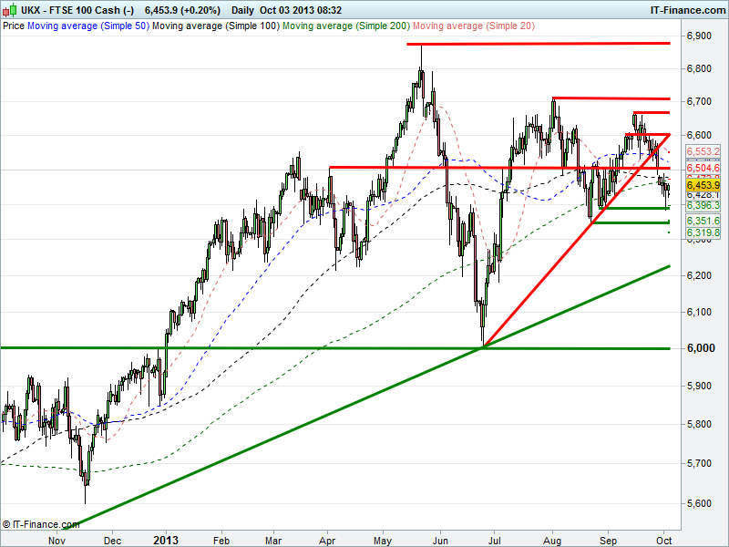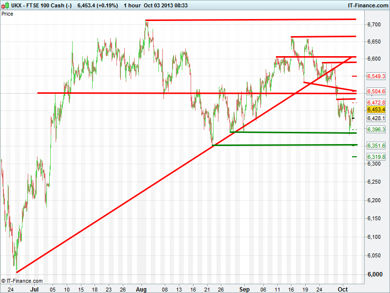 Yesterday’s foray below 6400 was a worry at the time, but rebound and subsequent rising lows and support at 6440 is a good sign, especially if we can break back above 6460. That’s not to say all will be well if we do. There are many hurdles ahead, due to the the 300pts we have given up since mid-month, and of course political headwinds.
