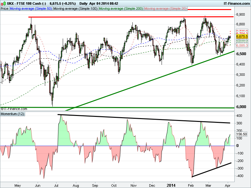 A break above 6685, keeping the 2-week rally alive, would likely open up the possibility of a move to 6700 and possibly 6750, and then even towards the end-Feb highs of 6875 which have held the index back since last May. We still like the fact that falling highs from Feb have been exceeded. The sideways channel on the week graph could also be a platform for a breakout, but we are wary of the 1-month graph showing a rising wedge which could break to the downside on any data disappointment.