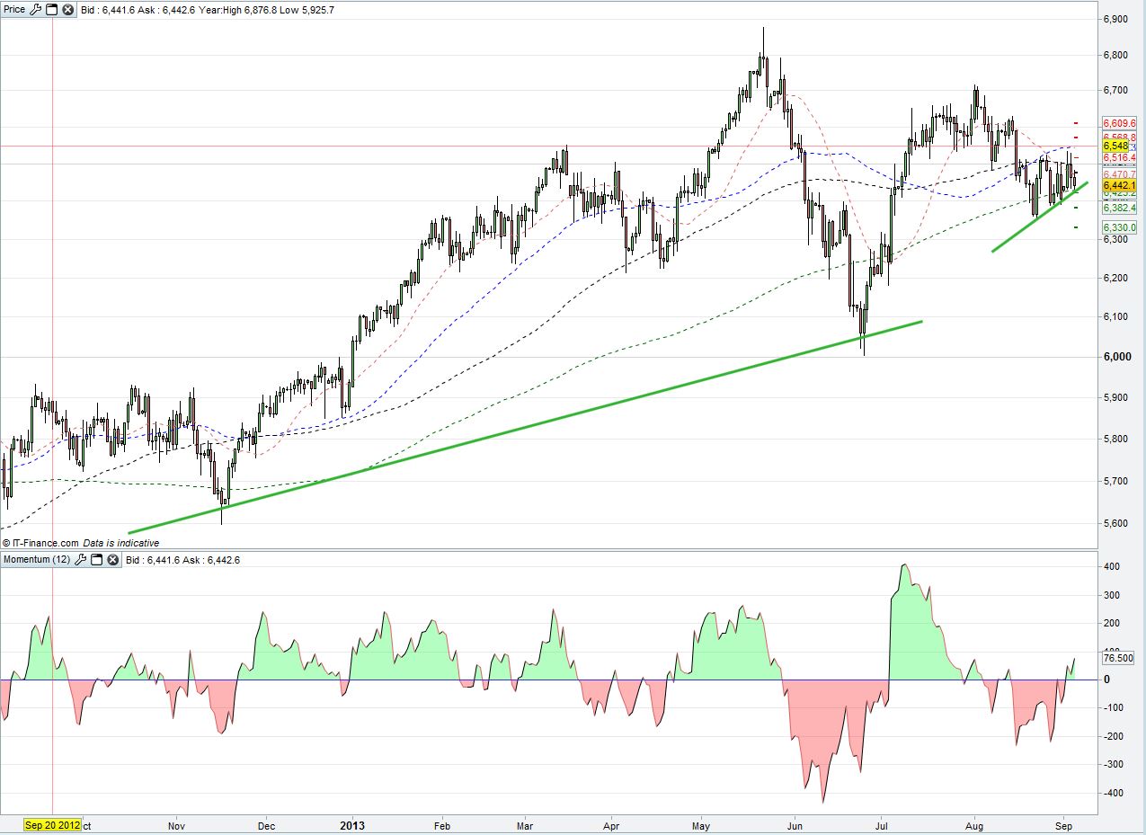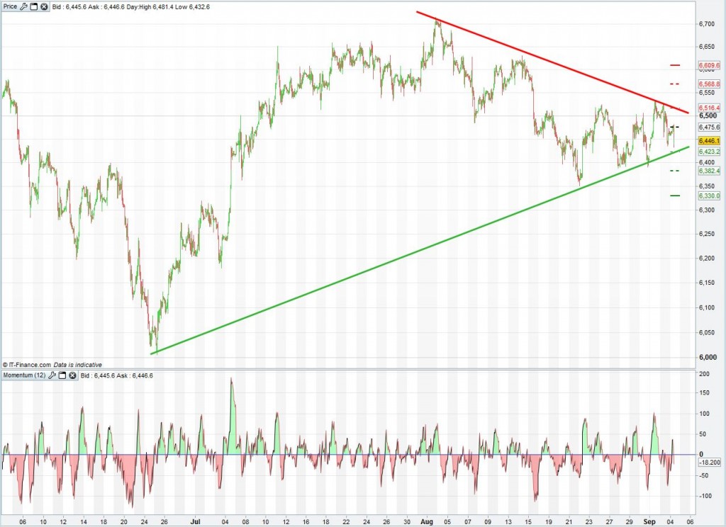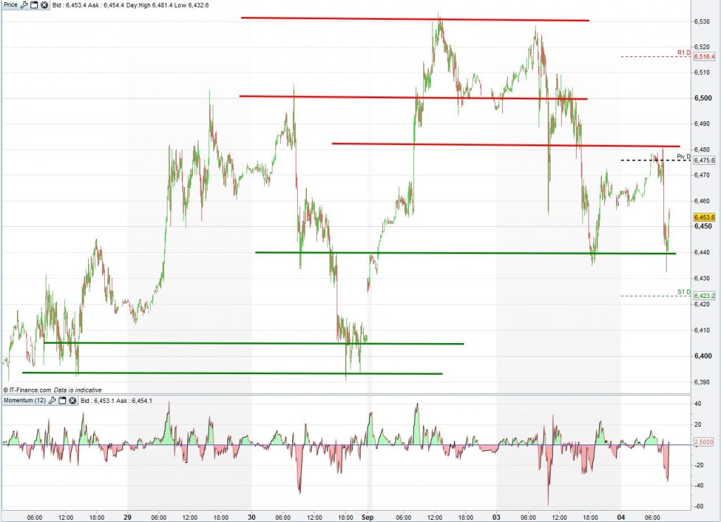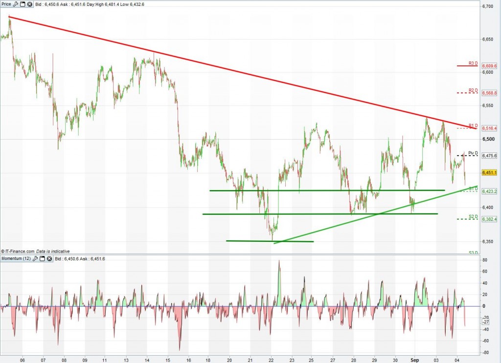 The UK Index failed to close above 6500 yesterday as heavyweight tech giant Vodafone lost 5% weighing heavily on the market (22 points) and rumours from Russia of military action in the Mediterranean causing fear amongst investors. Today’s dividend impact of 4 points has added to the fall of the UK Index which could find support around 6423 and then at 6382 should that be breached. Upside resistance has been seen at 6475 today with a break of that level potentially seeing a test of 6500 again and then 6516. With a raft of PMI data from across Europe due this morning as well as US data this afternoon, we could see these support and resistance levels tested today.