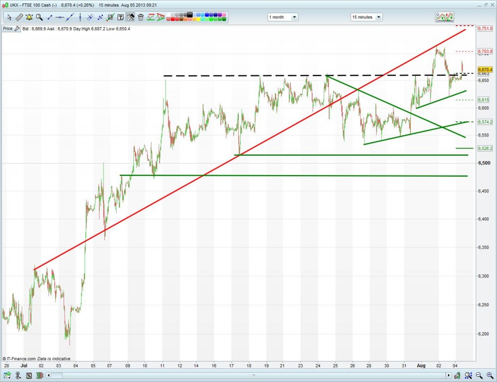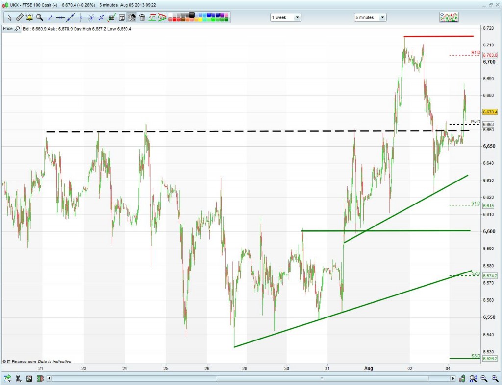 While uptrend intact, watch for support around 6660 as platform for recovery rally part II. Even if weakness does take us back below 6650 though, the rising lows of late could see support kick in around 6635 and then 6575. Watch also for how much of a fight the recent high 6715 puts up.