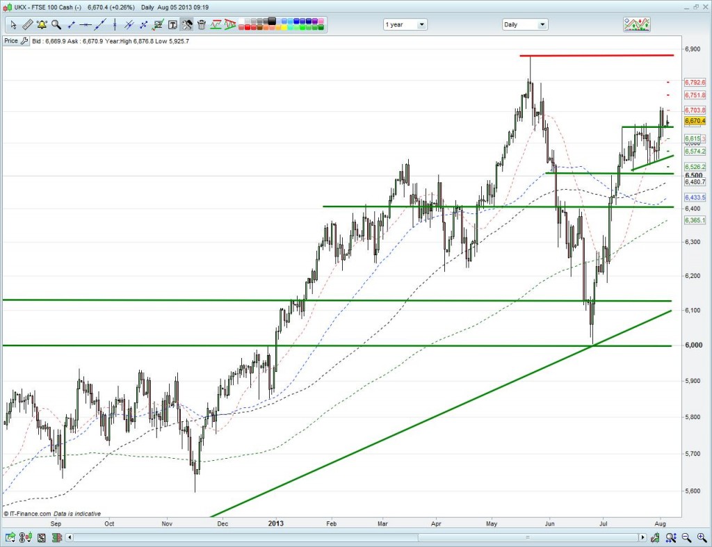 Since the breakout around 6650/6660, we’ve retraced and found support there again which is a positive signal in terms of a continuation of the long-term uptrend following July’s sideways consolidation and May highs of 6875 being regained. Bullish undertone still bubbling.