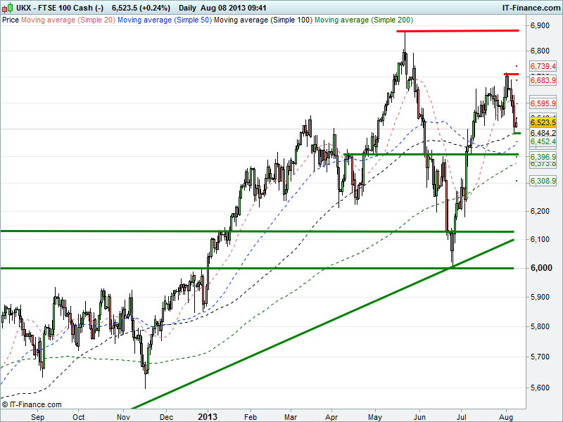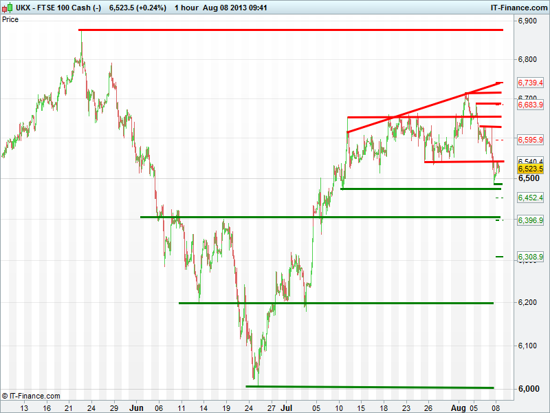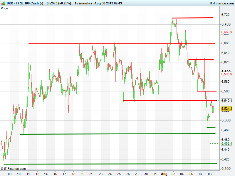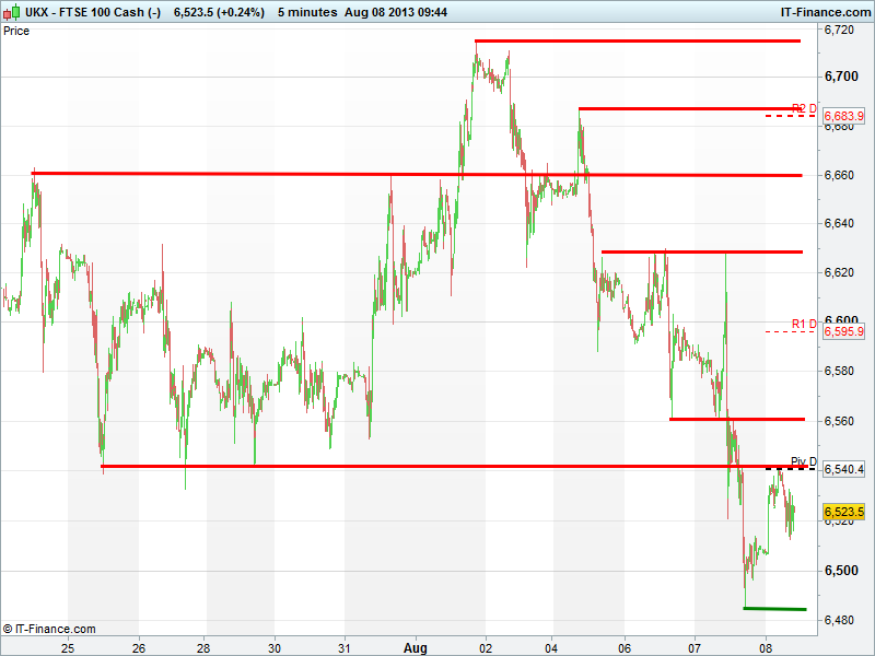 A fresh look at graphs results in net addition of red (potential resistance) after failure at some key levels yesterday as markets continued to fret over Fed tapering and interpretation/debate began on BoE’s new forward guidance. Pivot points (potential support/resistance) widened out again on yesterday’s 150pt high-low trading range.