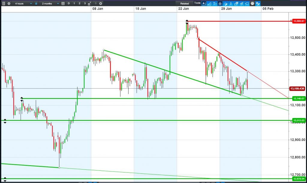 The UK Index 100 holds a falling channel that could take it sub-7500. The DAX 30 has been sent back south, from 13300 towards 13140. Dow Jones Futures under pressure from 26200 falling highs resistance. Gold sideways $1335-1349.