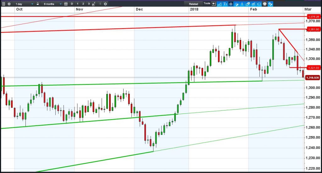 The UK Index 100 is back below 7200, struggling after last night’s 7230 breakdown. The DAX 30 has broken below 12300 to extend yesterday’s bearish reversal. Dow Jones Futures have found support at 24925. Gold nears major $1308 support.