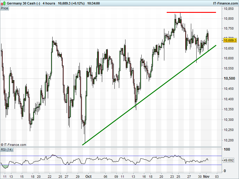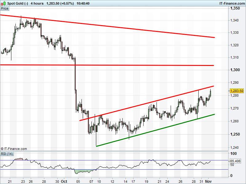 The  UK 100  has bounced from 6930 support, but can it deliver a breakout to 7000? The DAX 30 is still holding its October uptrend at 10650. Dow Jones Futures continues to tighten its range into 18200 ahead of the Fed update tomorrow and next week’s election. Which way will it break? Gold is back at the top of its $1265-1285 rising channel.
