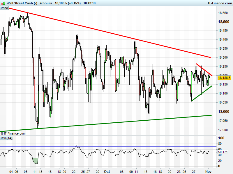 Dow Jones Futures continues to tighten its range into 18200 ahead of the Fed update tomorrow and next week’s election. Which way will it break?