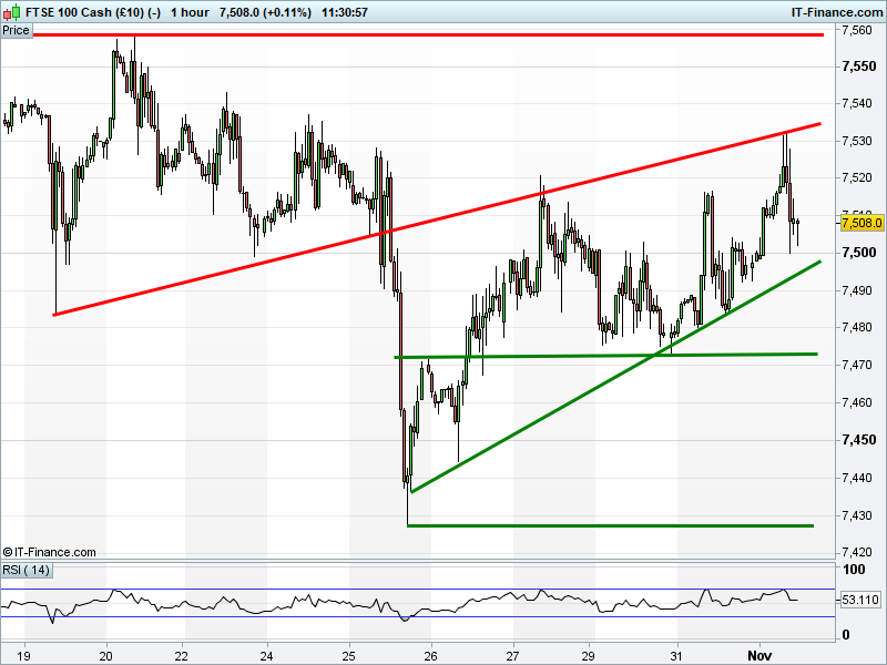 The UK Index 100 is back from 7530 highs, but holding above 7500.