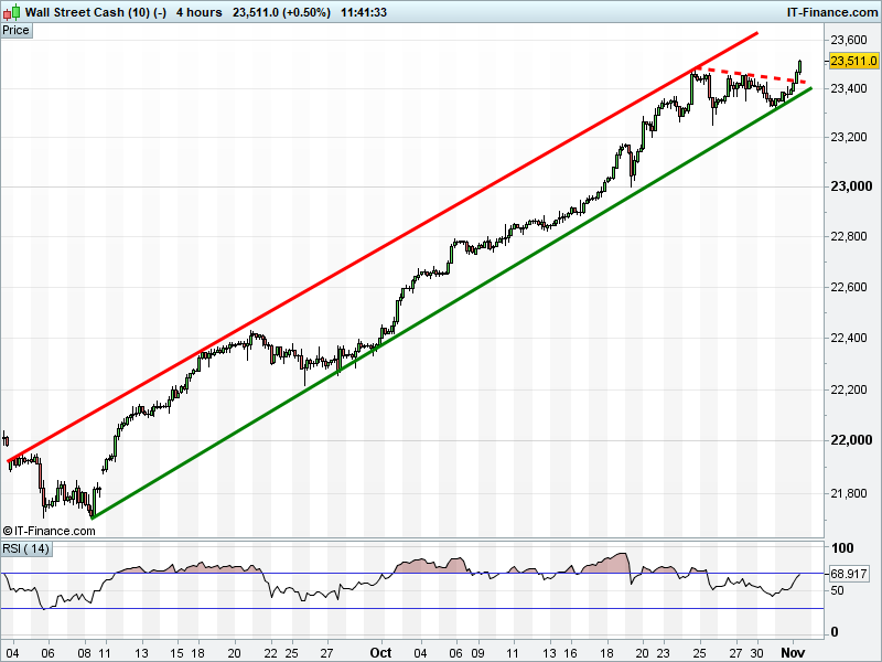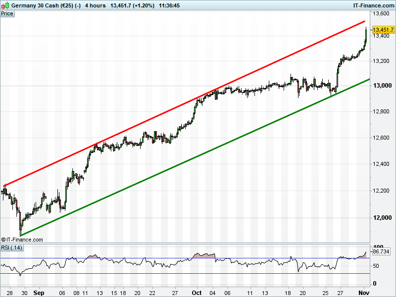 The DAX 30 has accelerated towards the 13500 ceiling of a 2-month rising channel.