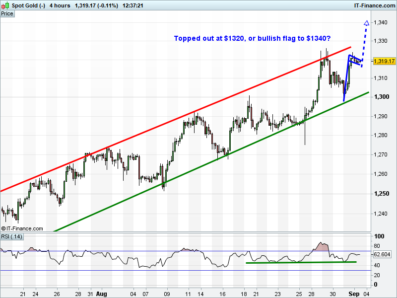 Gold has paused at $1320. Topped out or bullish flag? A weak US jobs report could send USD lower to help the precious metal higher.