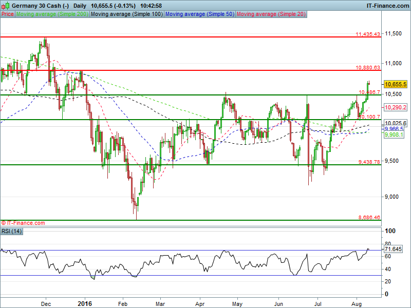 The DAX 30 is mid-way between the floor and ceiling of a potential new range. Note the RSI has turned back from overbought.
