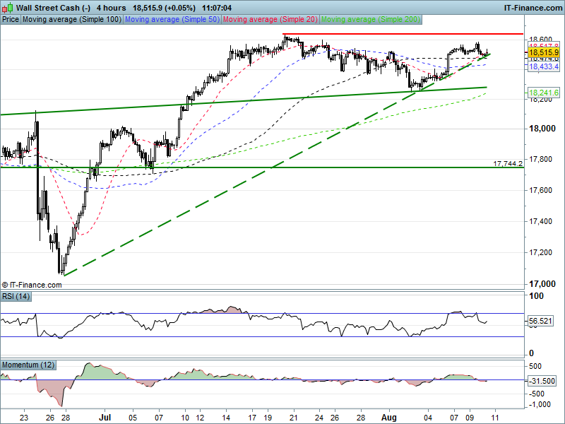 Dow Jones futures have bounced off rising support, however the 20-period moving average is currently a hurdle to northerly progress.