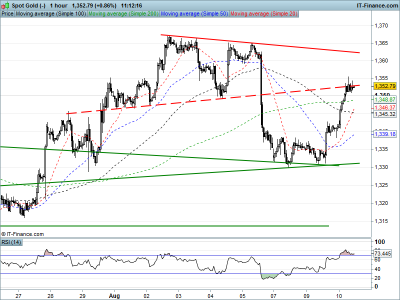 A break above 6875 is now needed to put the UK 100 on track for 6900 and 7000. The DAX 30 is looking toppy in the short term with a resurgent Euro putting pressure on German exporters’ shares. Dow Jones futures have bounced off rising supportand are testing their 50-hour moving average. Gold is struggling now with resistance around $1353, despite US Dollar weakness, indicating that risk-on sentiment could be prevailing and thus better times for equity markets.