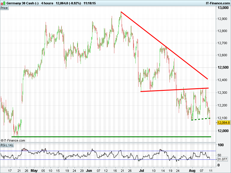 The UK Index 100 has broken below 7450, extending its retrace towards the 7365 floor its 6-week rising channel. The DAX 30 has broken below hitherto August support at 12100. Dow Jones Futures continue to hold around 22000. Gold remains on course for a test of $1300 and completion of a bullish flag.
