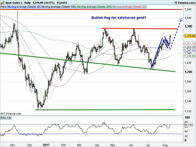 Gold remains on course for a test of $1300 and completion of a bullish flag.