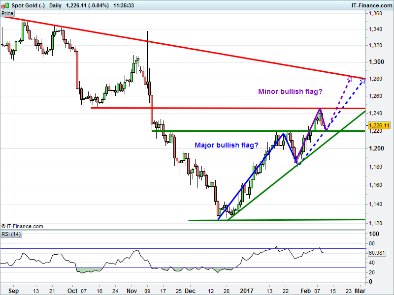 Gold has pulled back to support at $1222. Smaller bullish flag forming?