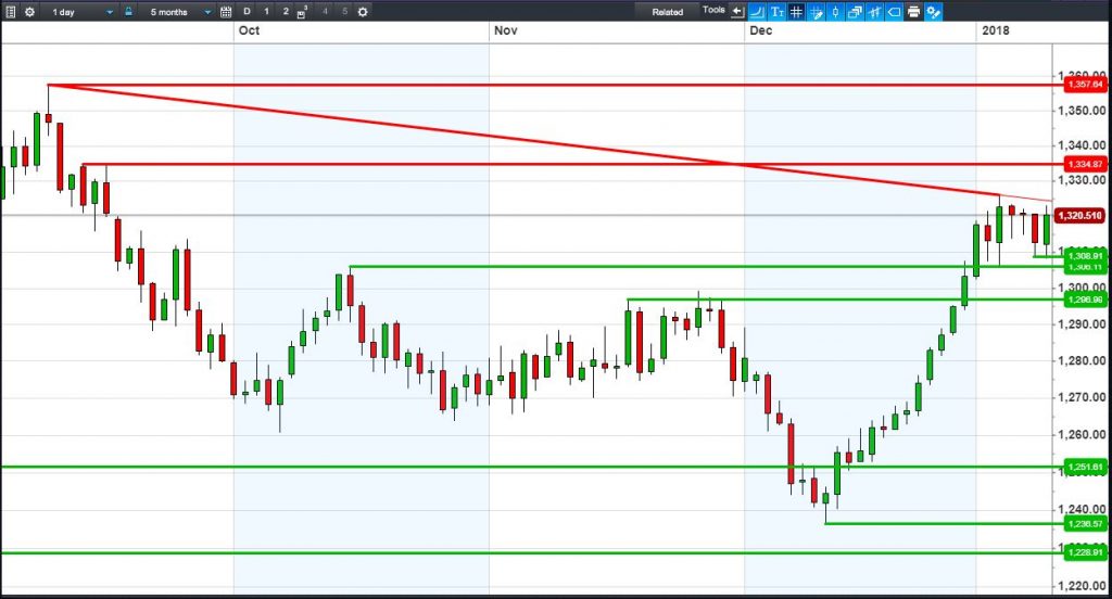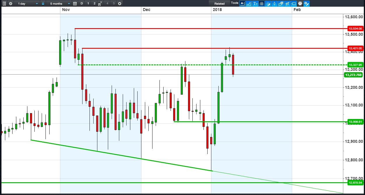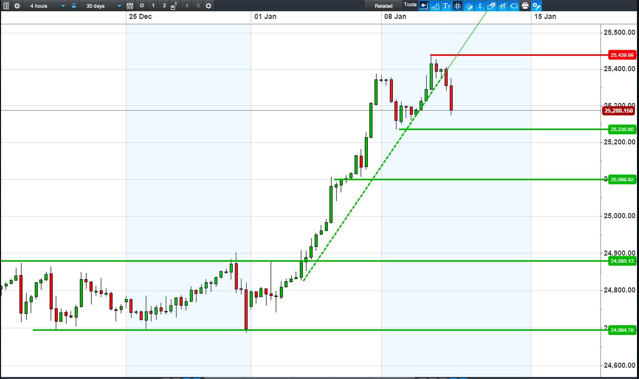 The UK Index 100 has turned back from fresh highs but is holding its December uptrend. The DAX 30 has broken back below 13300. Dow Jones Futures have broken January rising highs 25400. Gold continues to consolidate $1305-$1325.