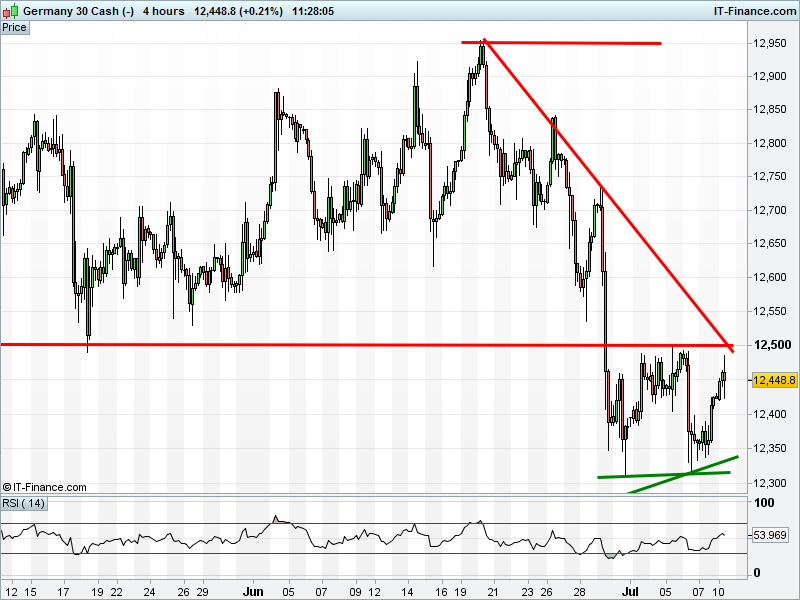 The DAX 30 is back from a flirt with 12500 recent highs and 3-week falling resistance. Bearish pullback or bullish break out?