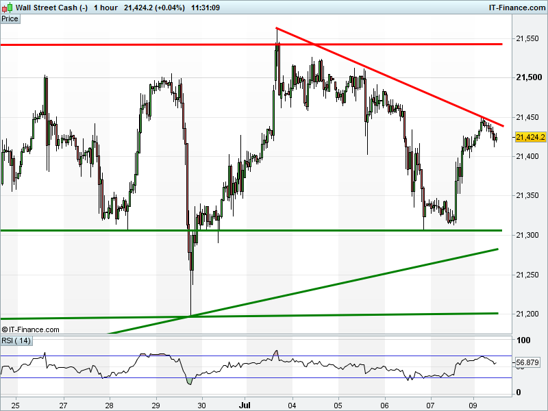 Dow Jones Futures are hindered by falling highs resistance at 21450. Potential for bearish flag?