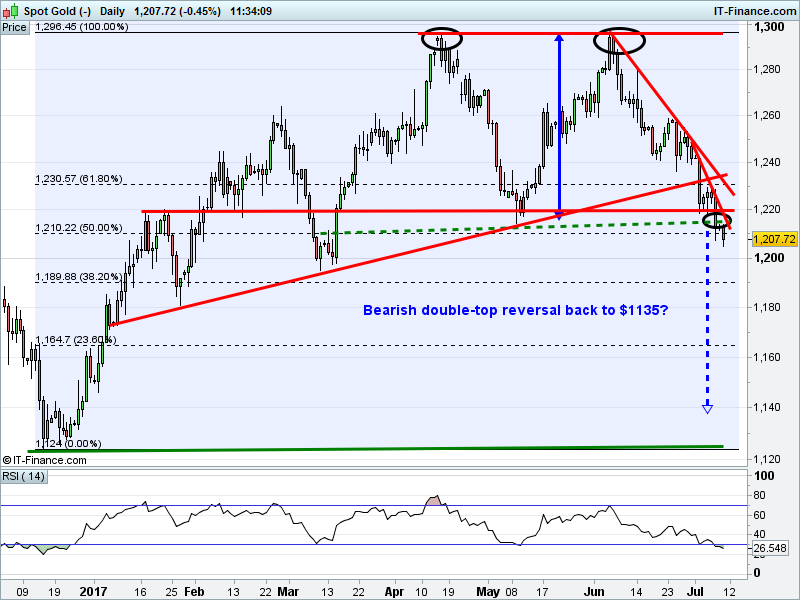 Gold could be embarking on a 5% bearish double-top reversal down to $1135. Fed hikes make gold more expensive to hold in relative terms.