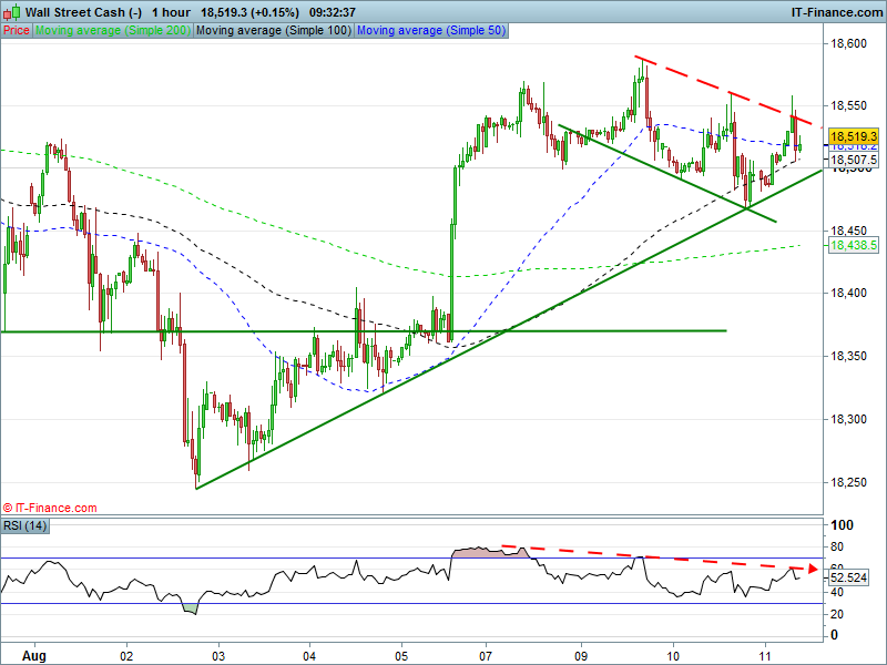 The UK 100 is on the back foot although support is holding at rising lows from last week. The DAX 30 is consolidating after a strong Wednesday – some profit taking likely – ahead of another potential leg up towards 10880. Dow Jones futures have sold back from resistance at the ceiling of a 2 day falling channel. Gold is trading around and about its major hourly moving averages.
