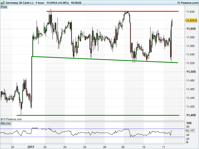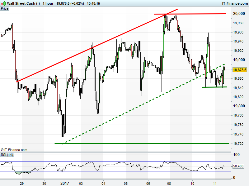 The UK 100  has bounced from 7260 in the midst of a 24-hour bullish flag that could help it break above 7300. The DAX 30 is rebounding from 11520 towards the 11640 ceiling of its 2017 sideways channel . Dow Jones Futures have found support at 19840 after a breakdown from its 2017 up channel. Rebound or support turned resistance. Gold is struggling to better $1190 since yesterday, still in an uptrend but with negative divergence on the RSI.