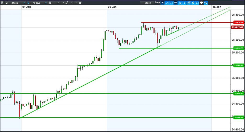 Dow Jones Futures are back just shy of Tuesday’s 25440 record high. Bullish ascending triangle?