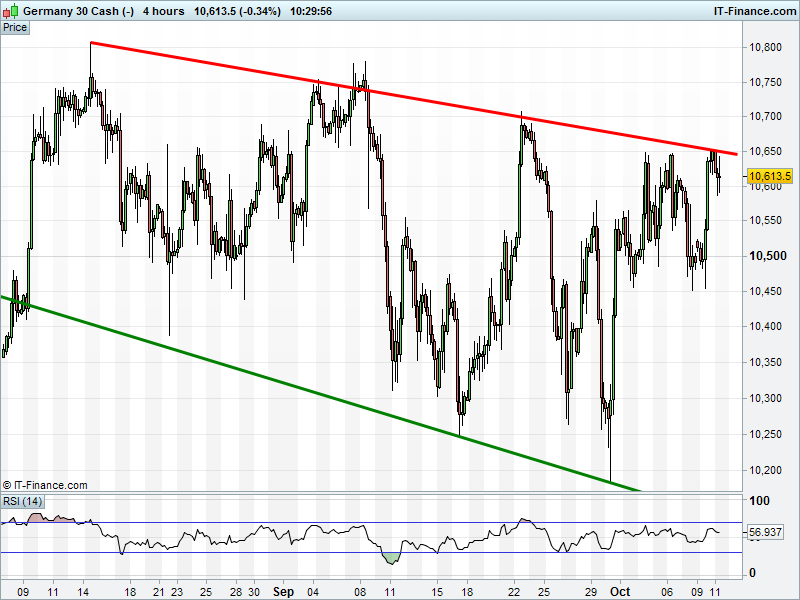 The DAX 30 has been halted again at 10650 by the ceiling of its 3-month down channel. Can it engineer a breakout, or is it headed back towards the channel floor?
