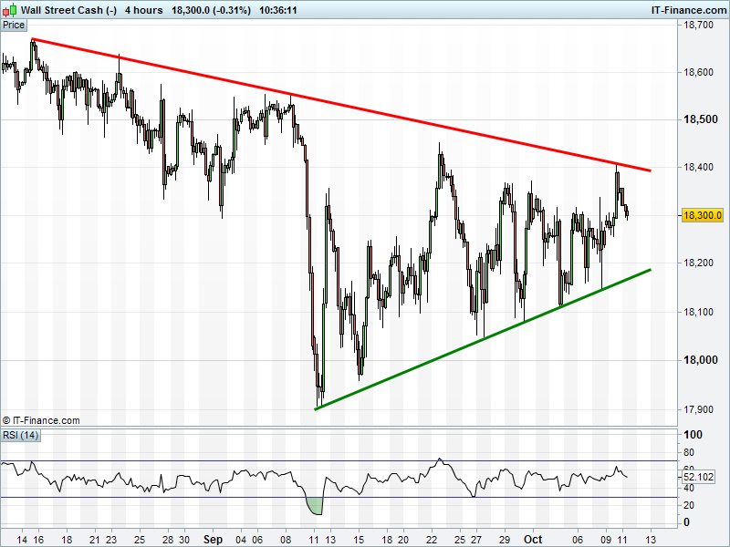 Dow Jones Futures have sold back from 18400 reinforcing the ceiling of its 1-month converging pattern. Support at 18300, or back to the 18200 floor?
