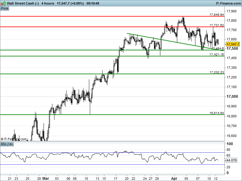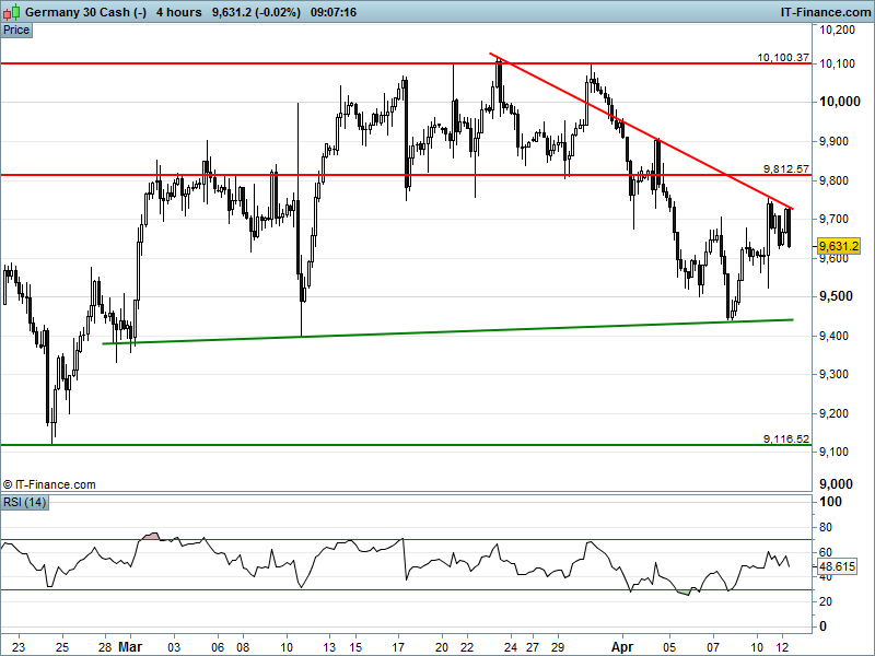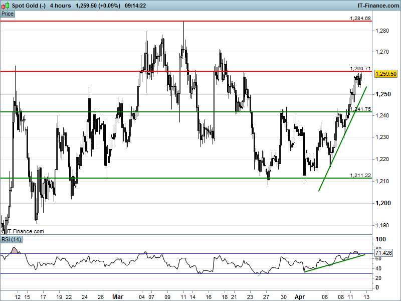 Technically, the UK 100 has found 10 Apr rising support, DAX30 is making a stern test of 9623, Wall Street/Dow futures continue to turn over and Gold is still negotiating safe passage past $1260.