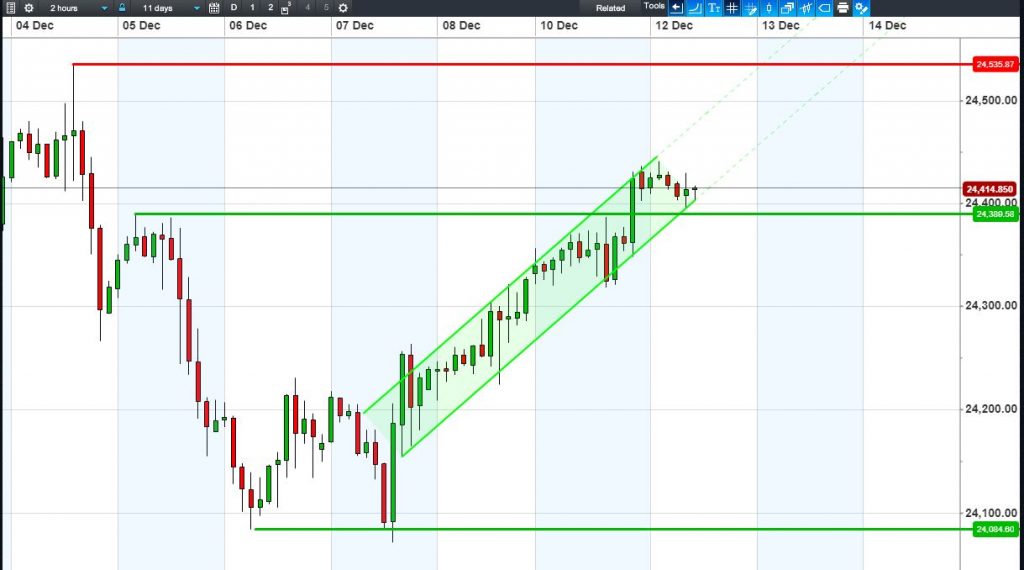 Dow Jones Futures sit in a rising channel now safely above 24390. Back to record highs?
