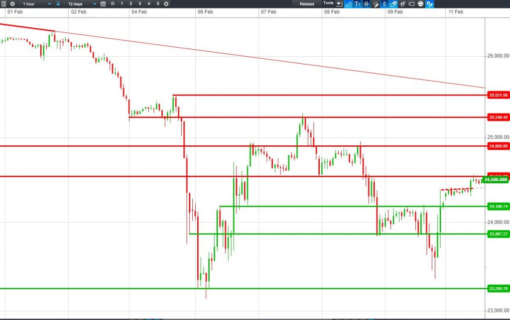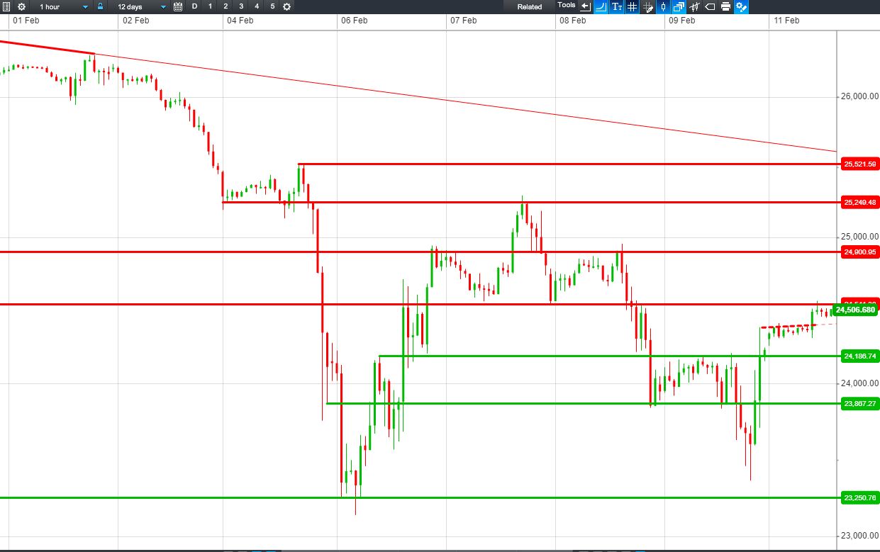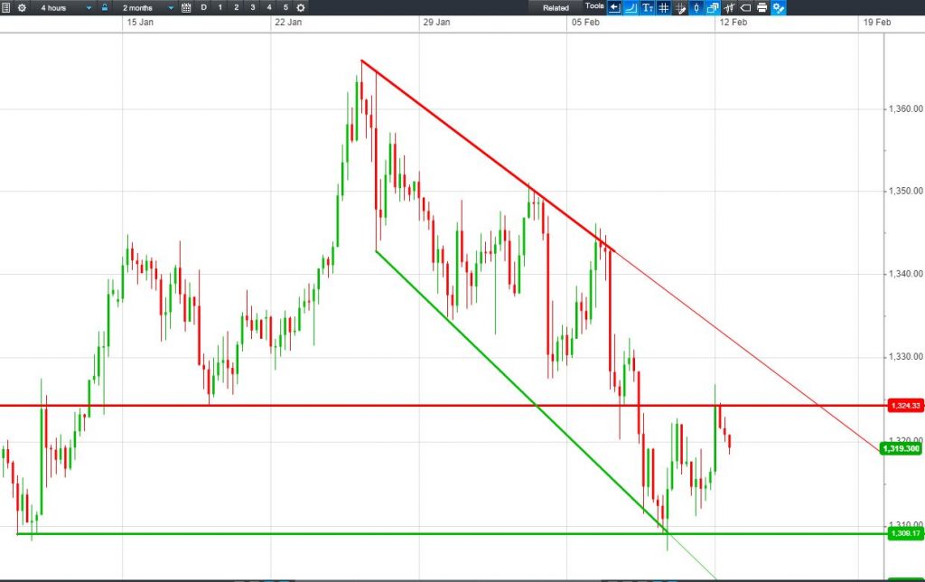 The UK Index 100 is making another bullish test of 7185 intersecting resistance. The DAX 30 is trading a narrow 12310-12385 range. Break higher or lower? Dow Jones Futures have broken out from overnight highs resistance. Can they achieve another leg higher? Gold is retreating from $1324 resistance as the US dollar recovers.