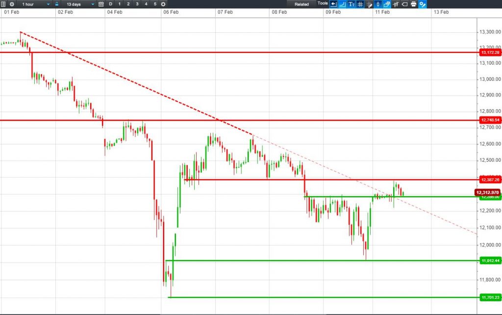 The DAX 30 is trading a narrow 12310-12385 range. Break higher or lower?
